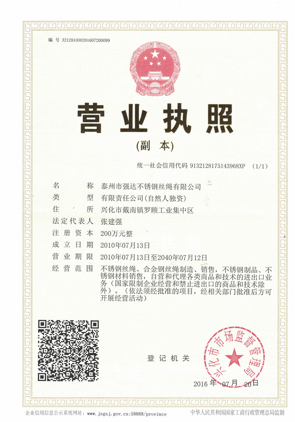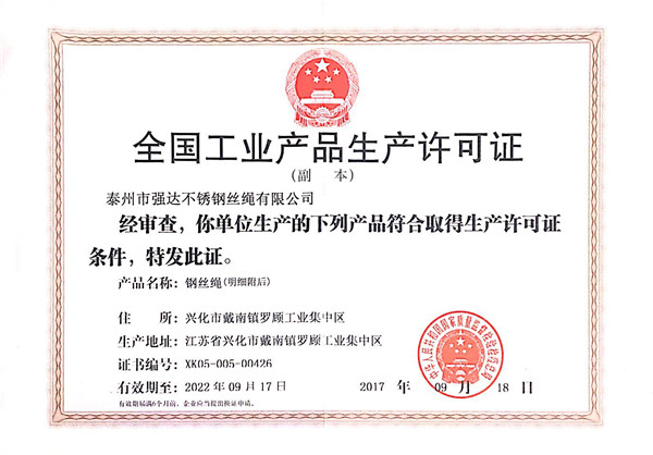 泰州市強達不銹鋼絲繩有限公司位于江蘇興化市戴南經濟開發(fā)區(qū),公司致力于不銹鋼絲繩產品生產,立志成為“國內技術標桿型吊索具生產企業(yè)”。以此戰(zhàn)略思想指導,公司堅決貫徹“質量贏市場,管理增效益,誠信贏天下”的質量方針。以完善的服務在國內不銹鋼絲繩市場樹立良好的品牌形象。公司榮獲“江蘇省質量信得過企業(yè)。 靈活的管理機制,經驗豐富的